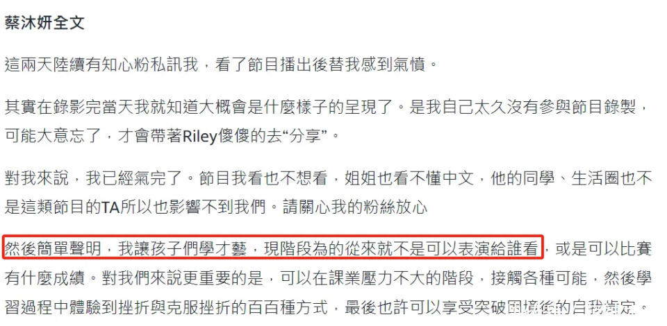当今,小S本东说念主还莫得针对蔡沐妍作念出复兴,独一节目制作主说念主露面线路小S莫得不好的意图。